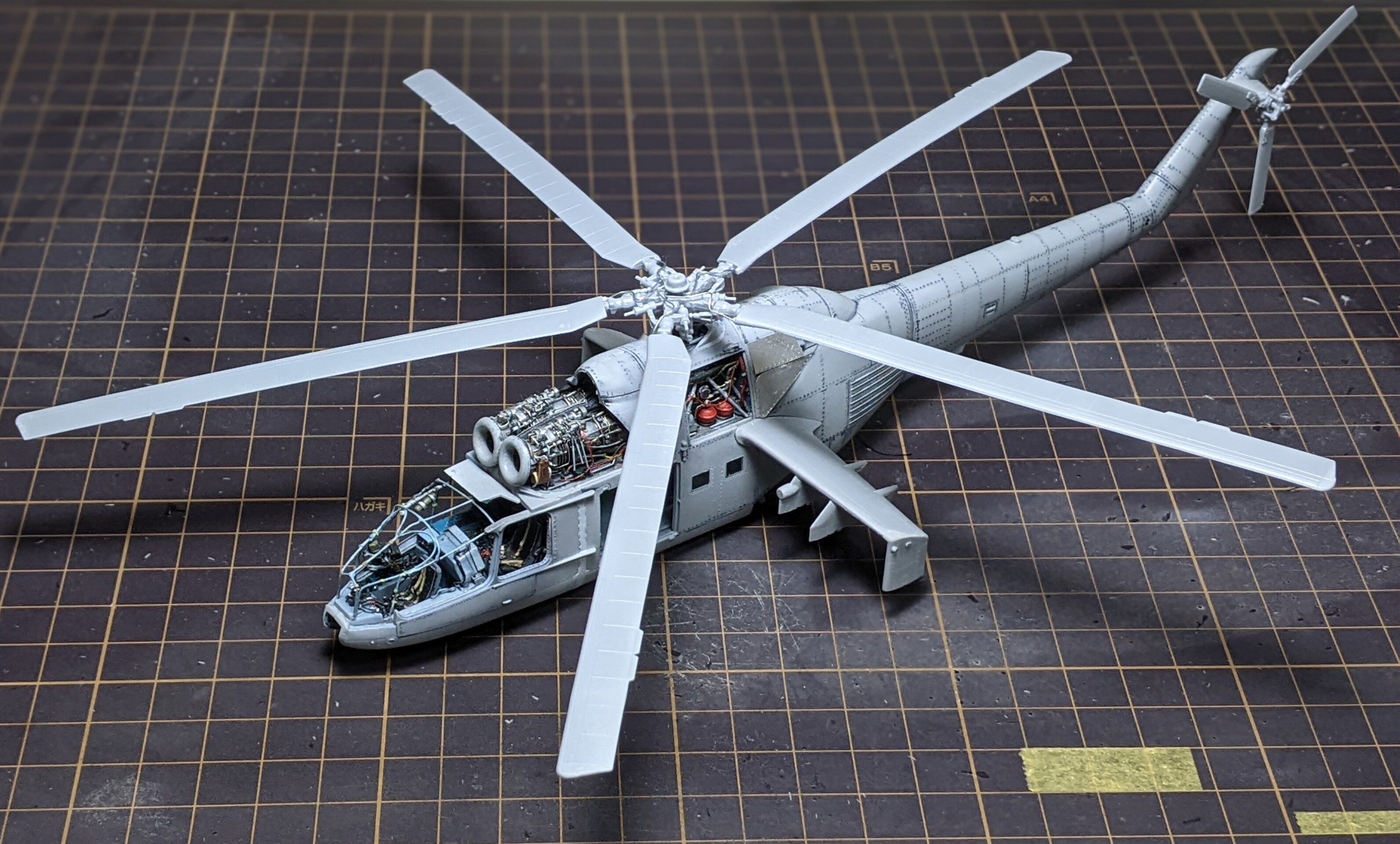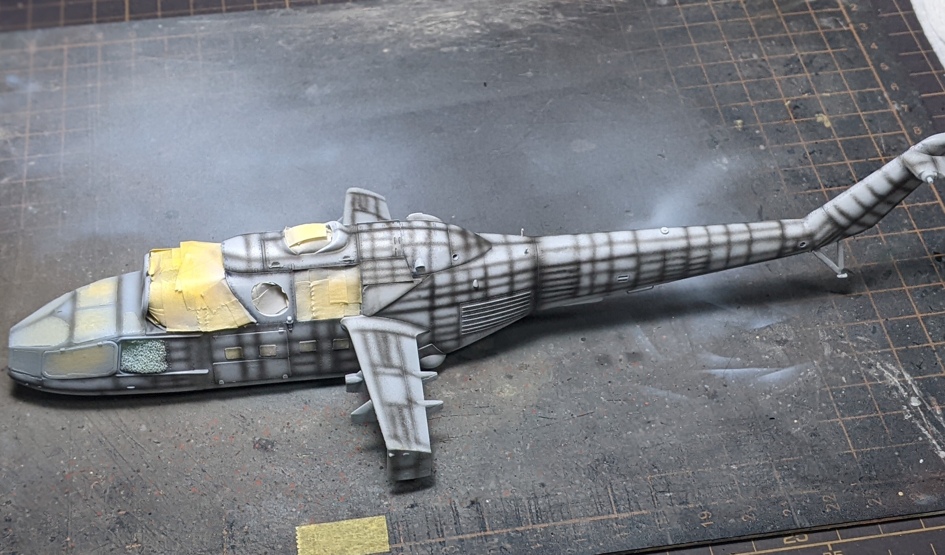 この後は、お腹ら辺を塗ってマスキング▶ベースを塗って迷彩▶ハイライト、影、全体の明暗調整▶エアブラシでのウェザリング的な汚し塗装……