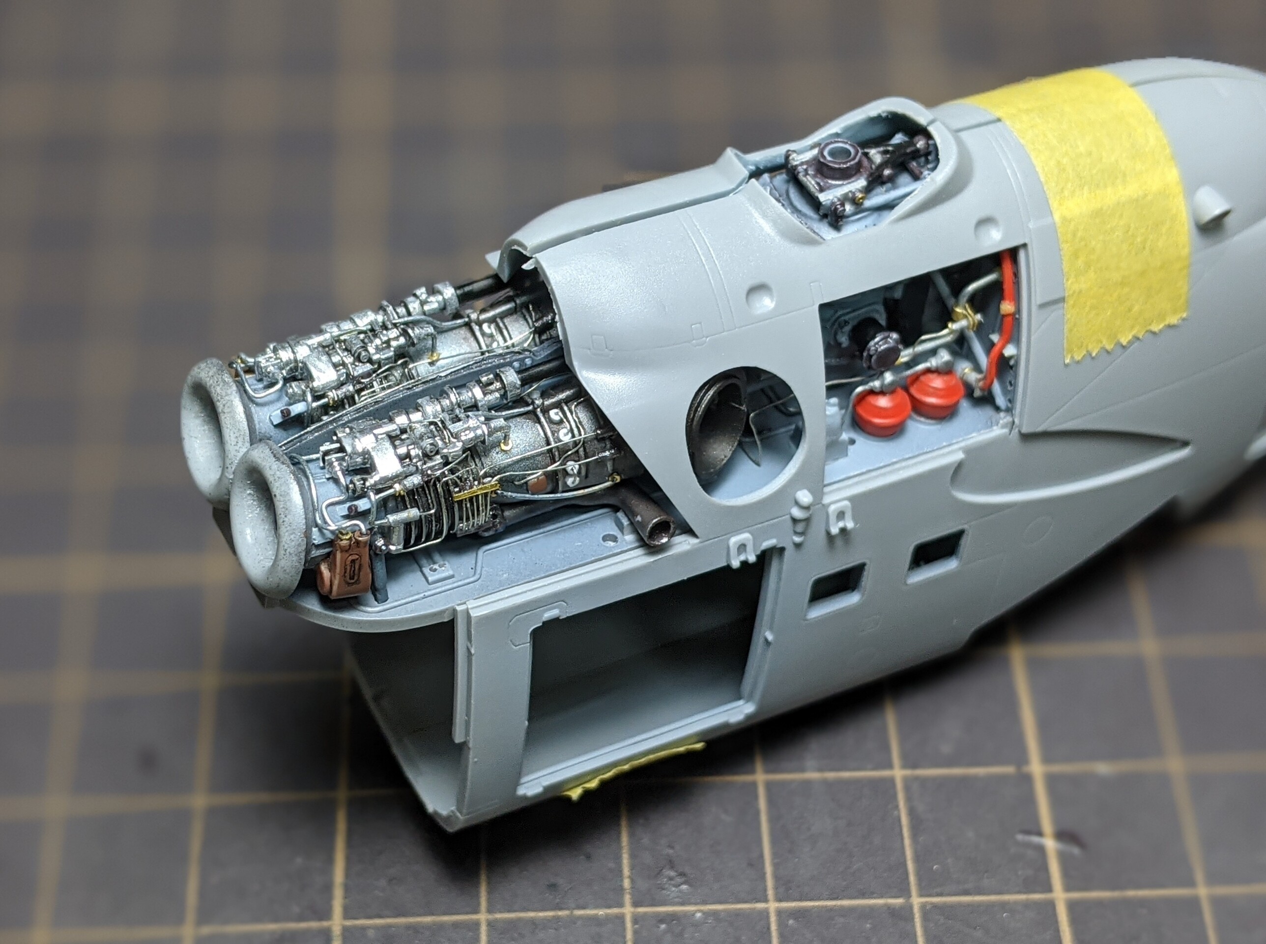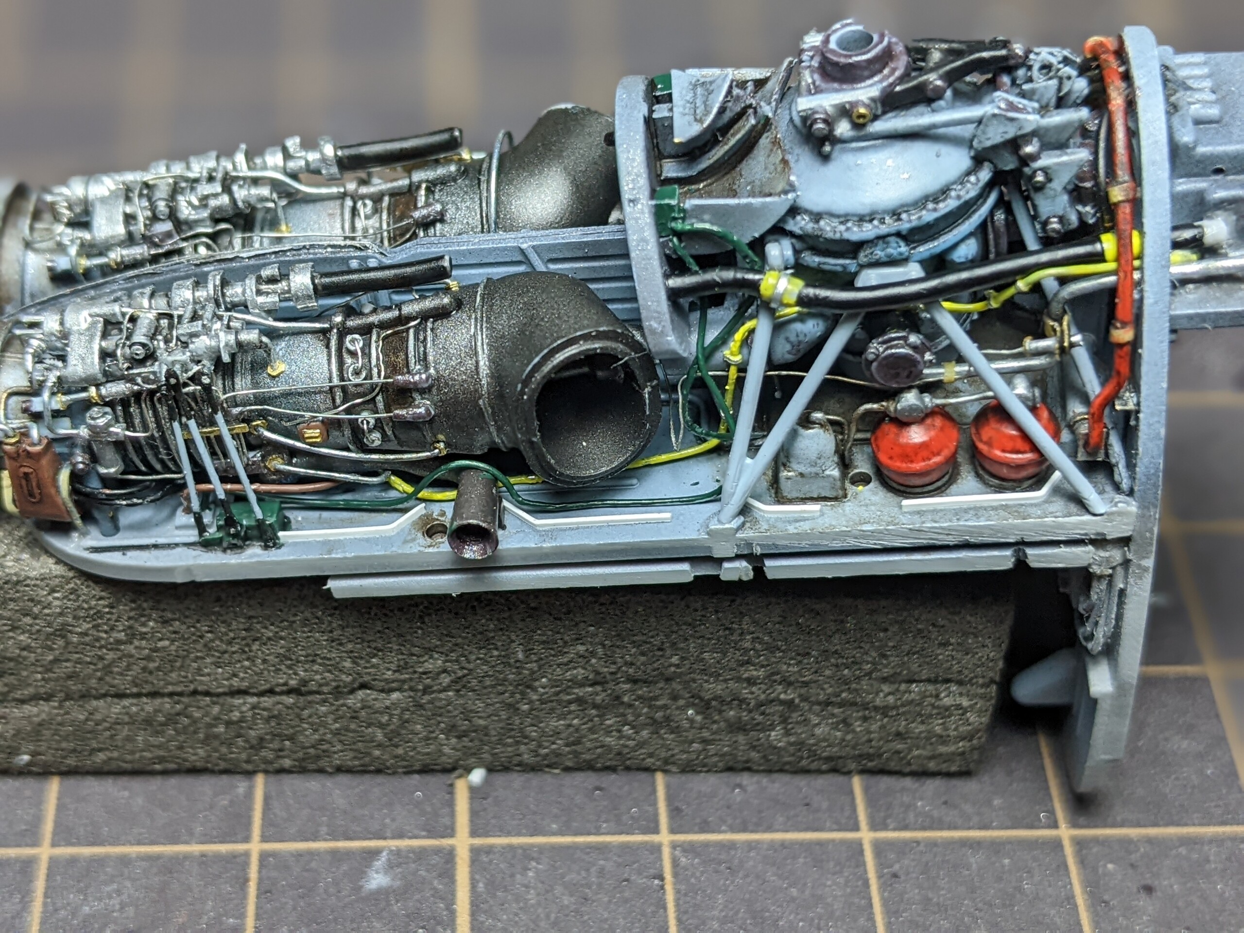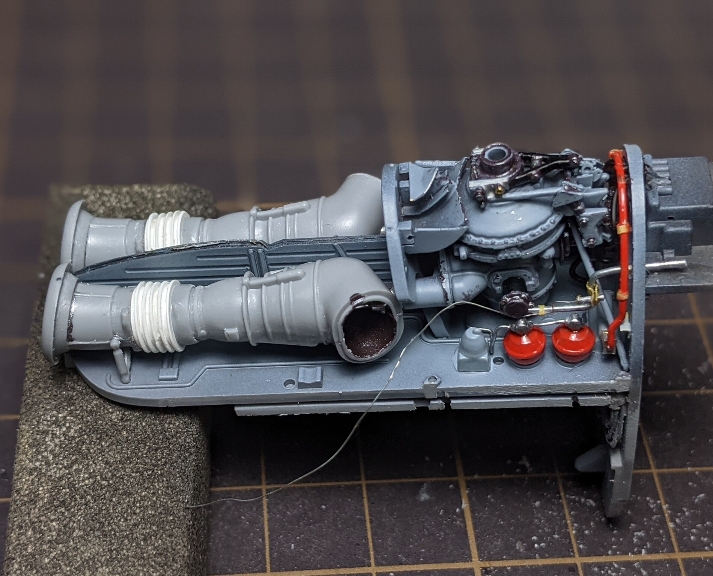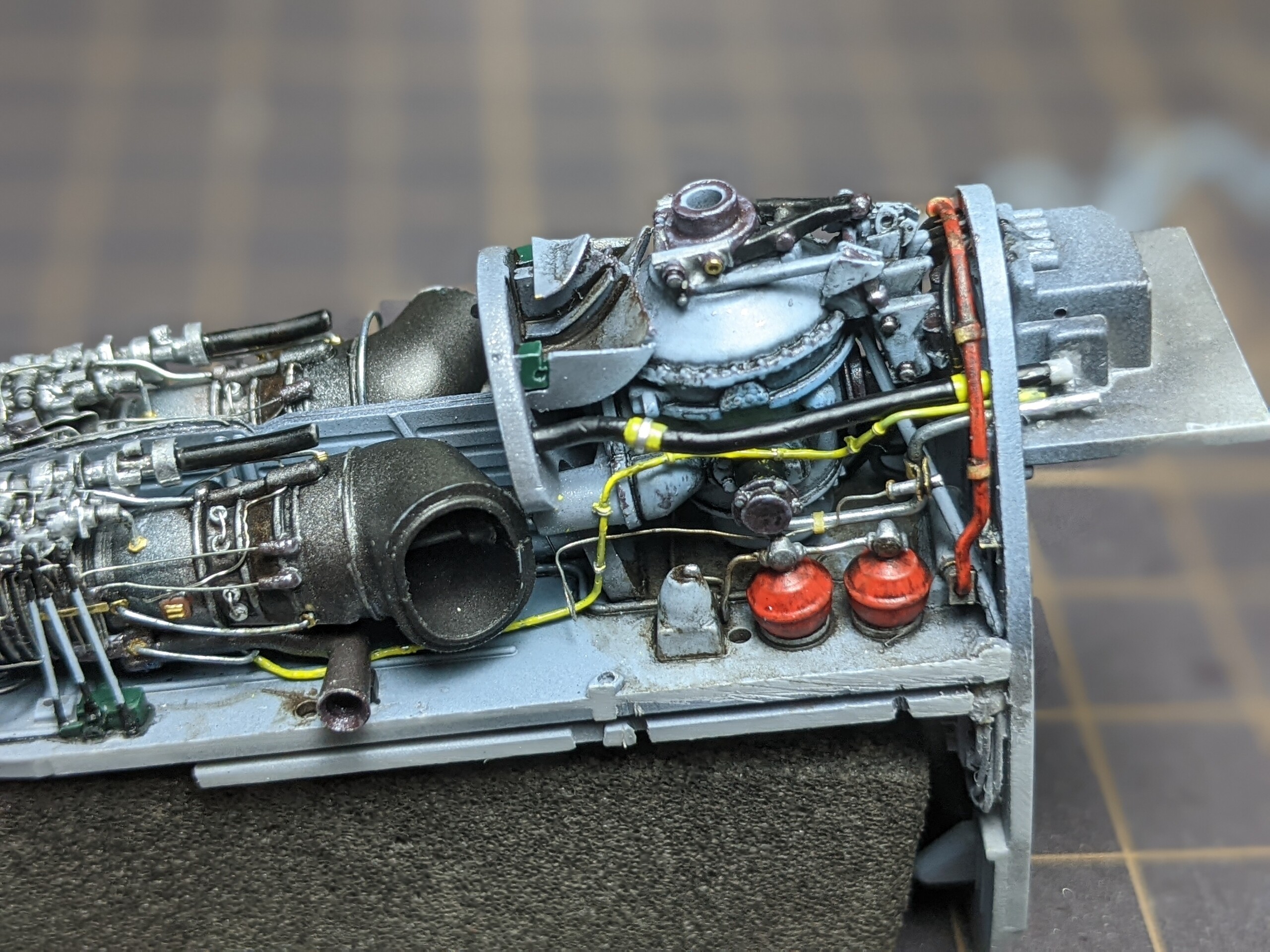 2機のエンジンの上には中程までもうひとつのタービンが被さるので、それによって見えなくなるか干渉するかのパイピングも基本的に省略です。