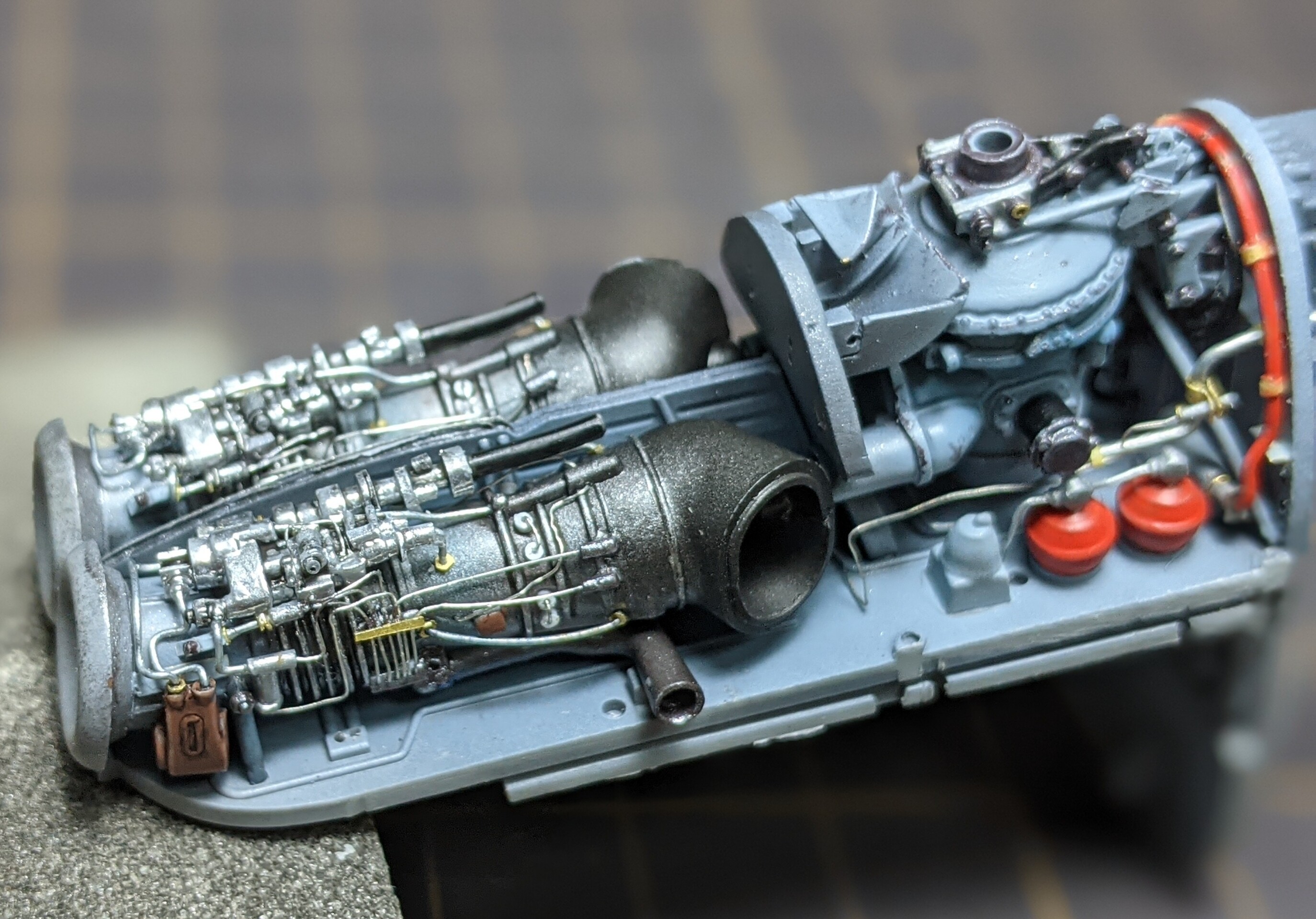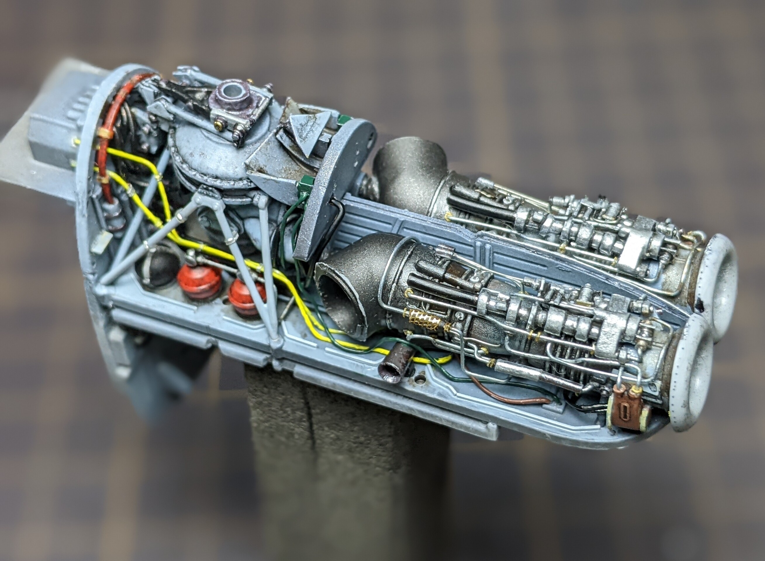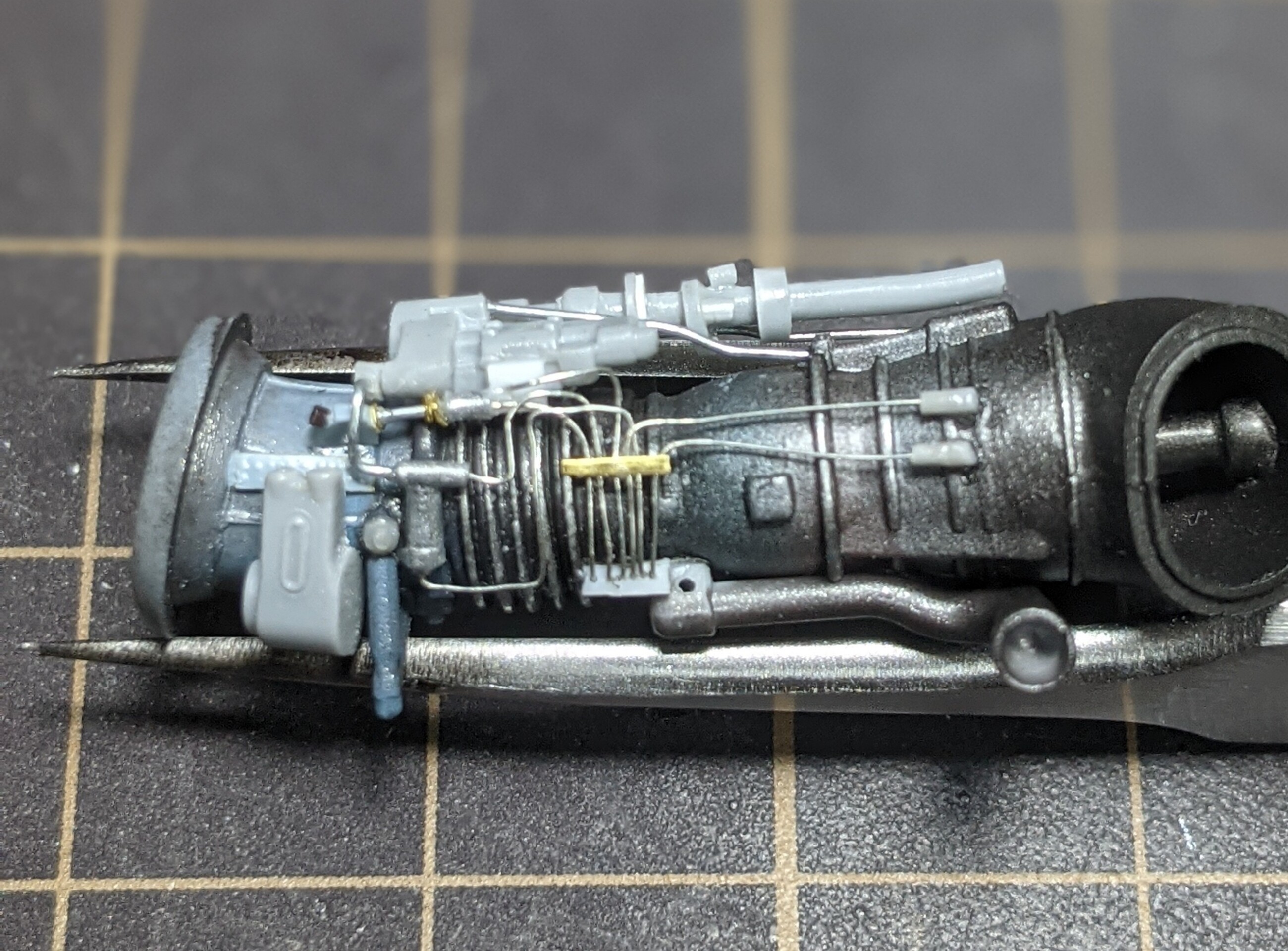 2機のエンジンの上には中程までもうひとつのタービンが被さるので、それによって見えなくなるか干渉するかのパイピングも基本的に省略です。