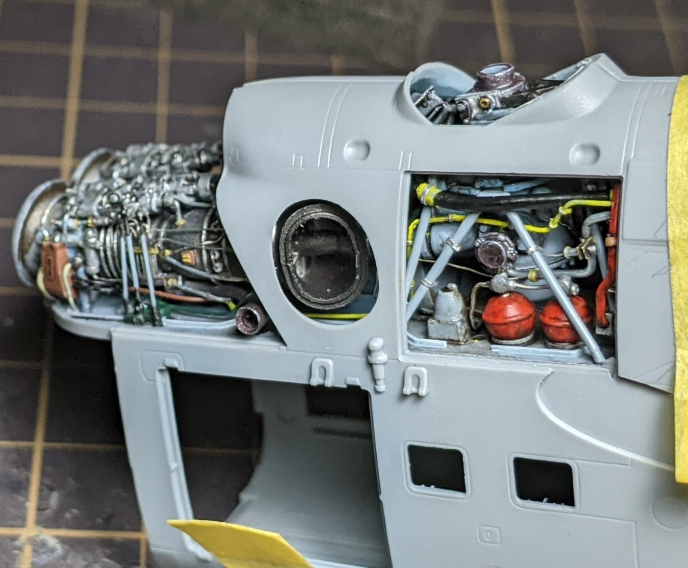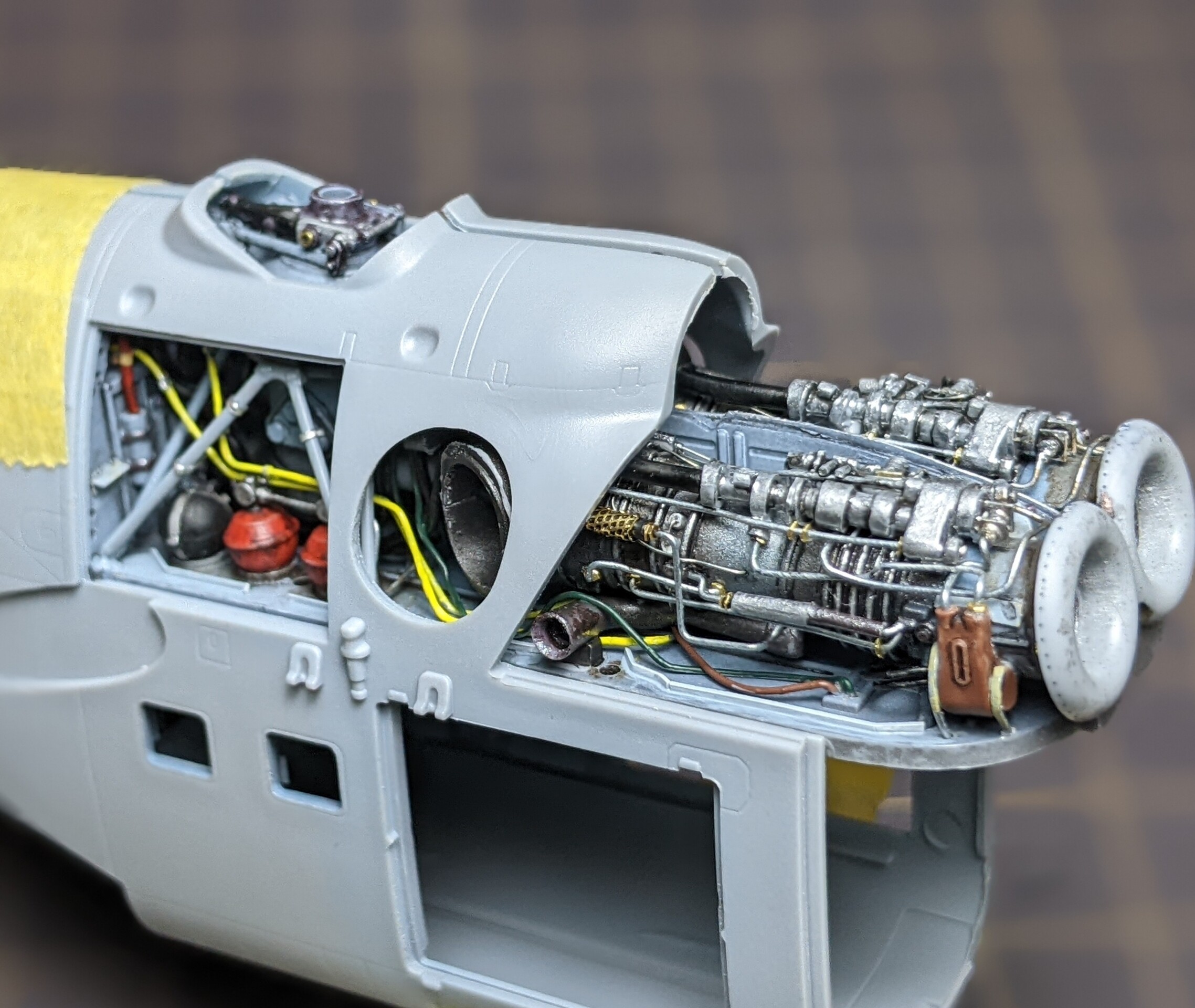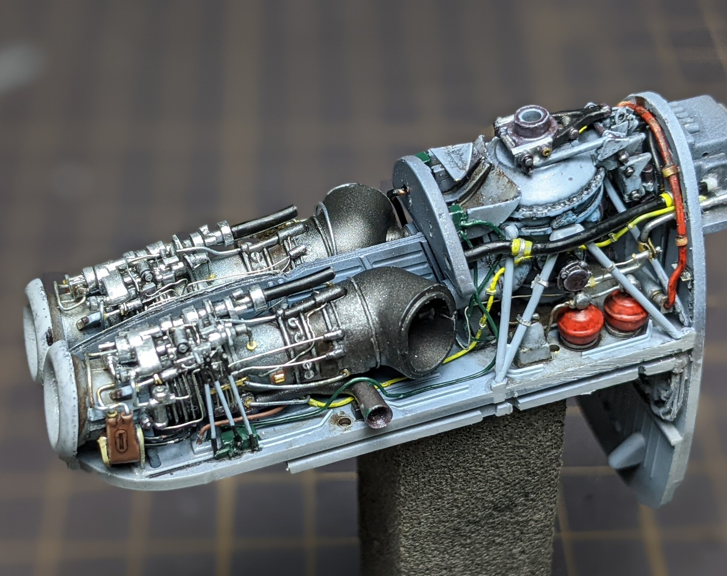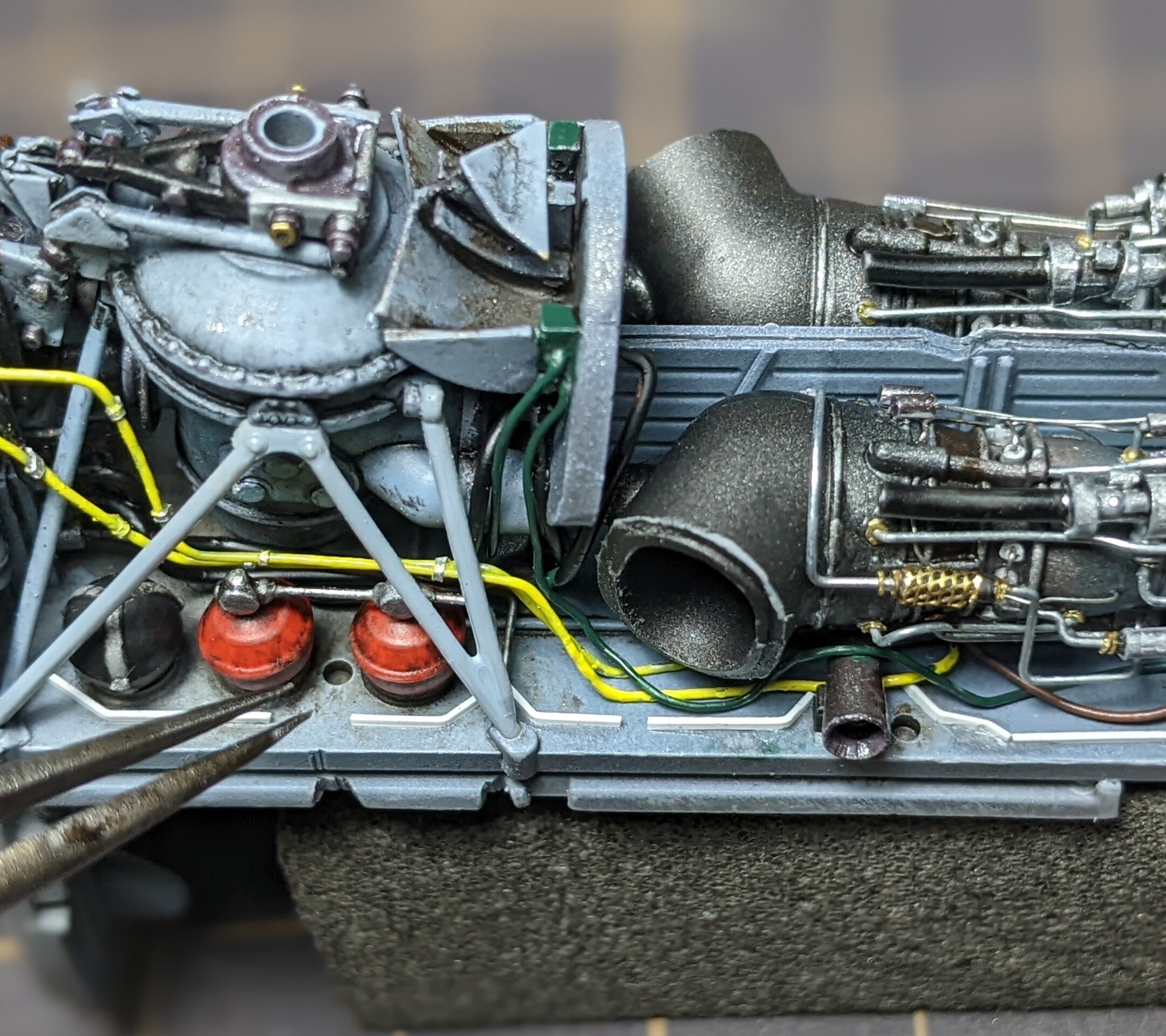 2機のエンジンの上には中程までもうひとつのタービンが被さるので、それによって見えなくなるか干渉するかのパイピングも基本的に省略です。