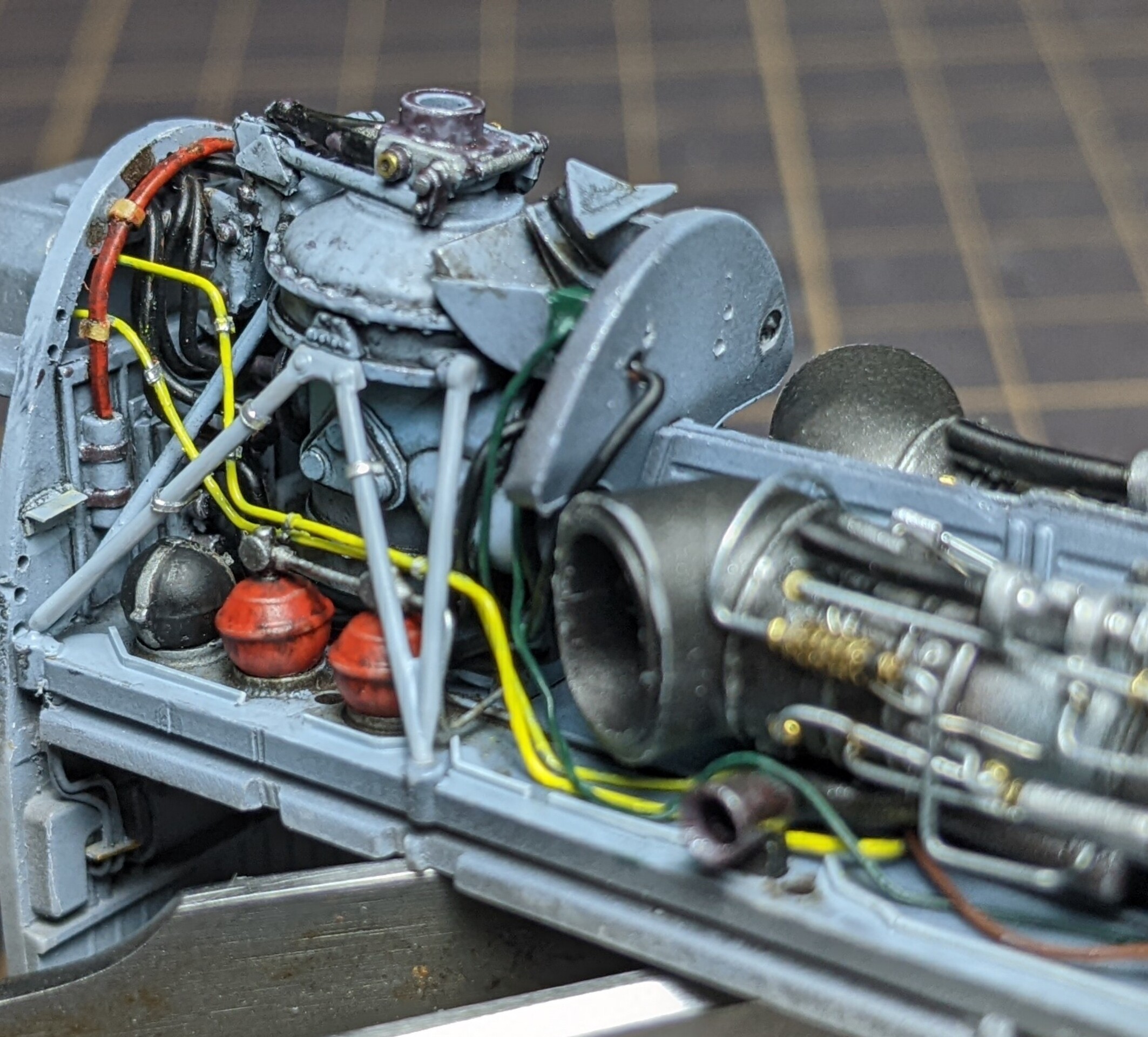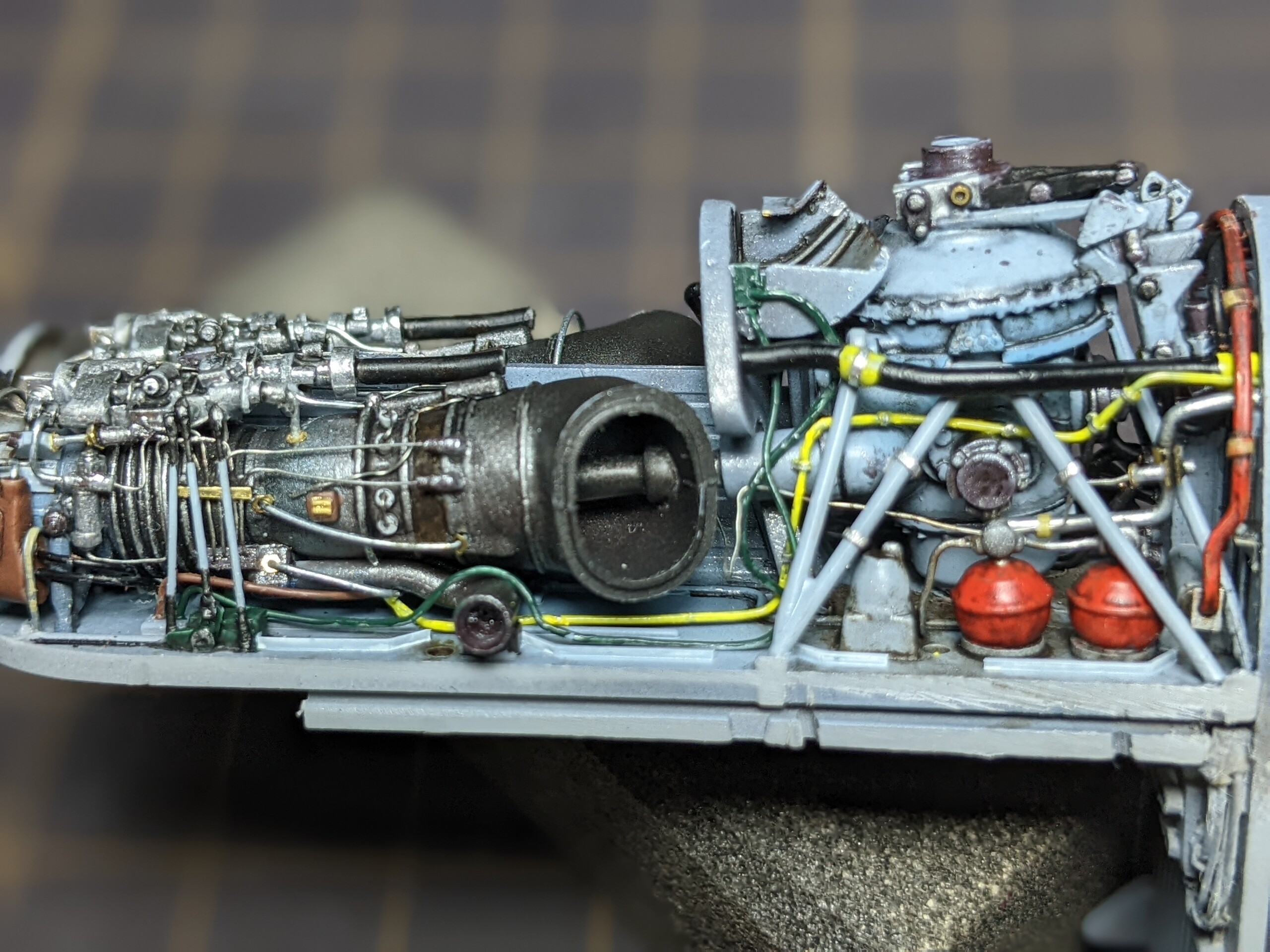 後は赤い線で繋がれる、主に電装系のパイピングを取り付ければこのタービンエンジン周りは一段落すると思います。