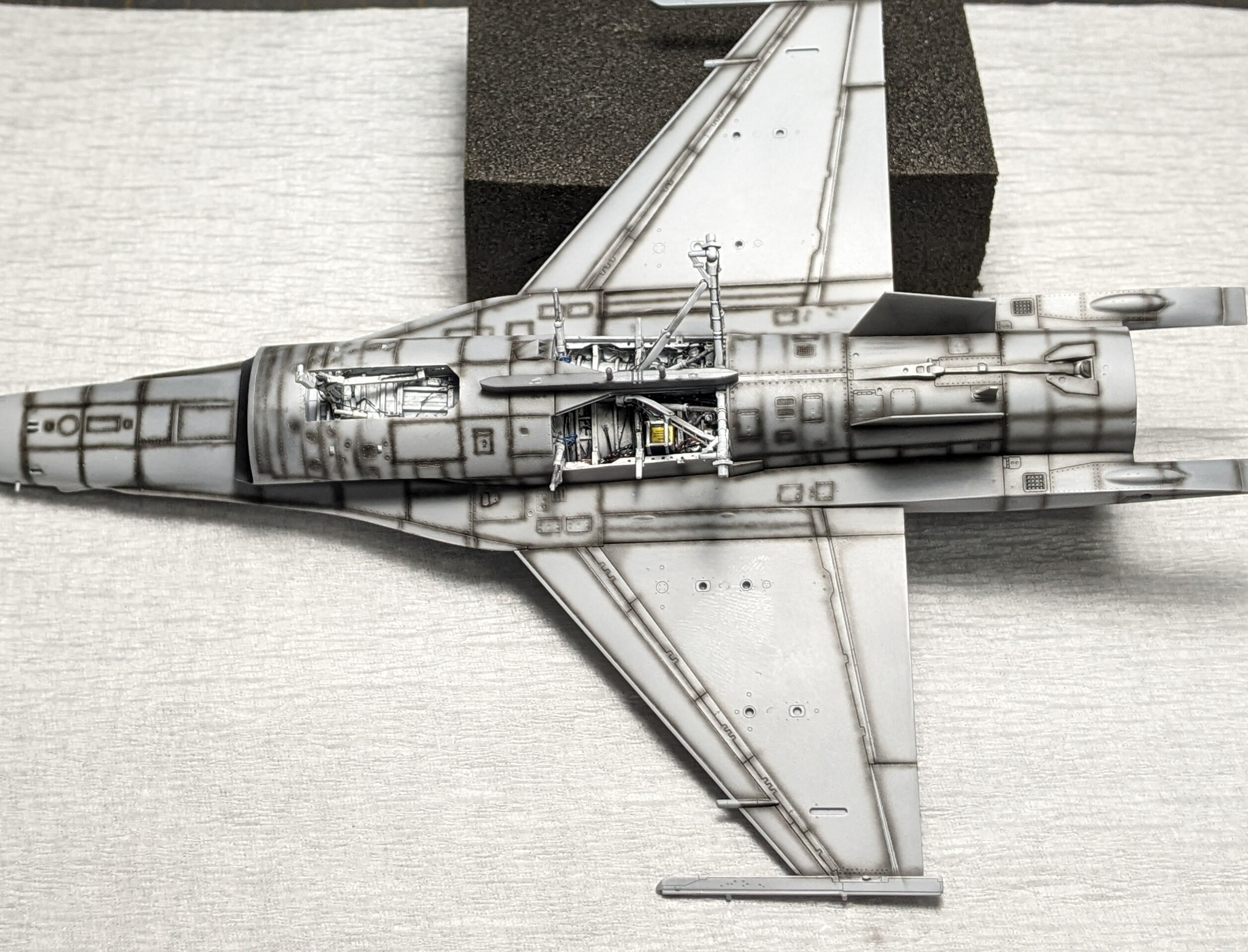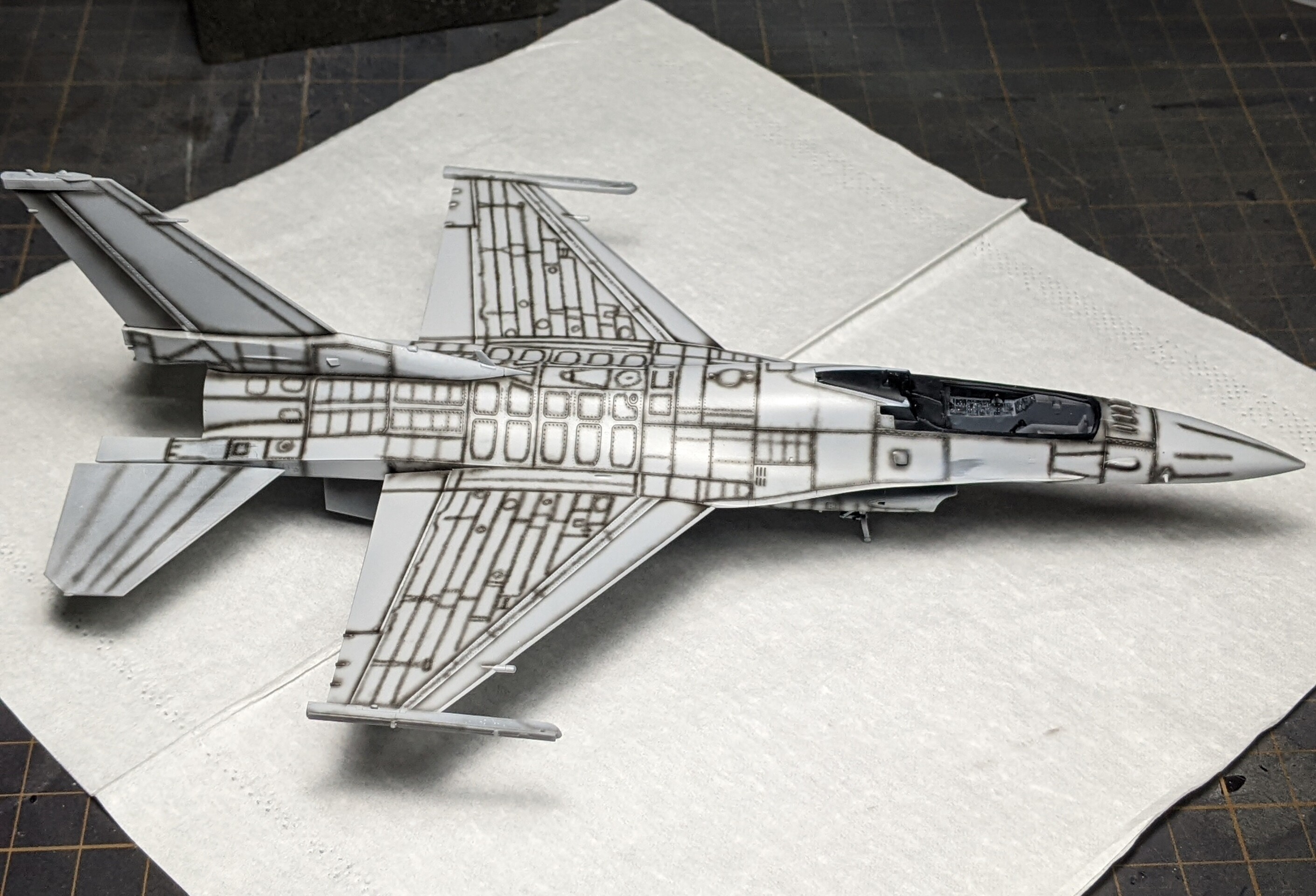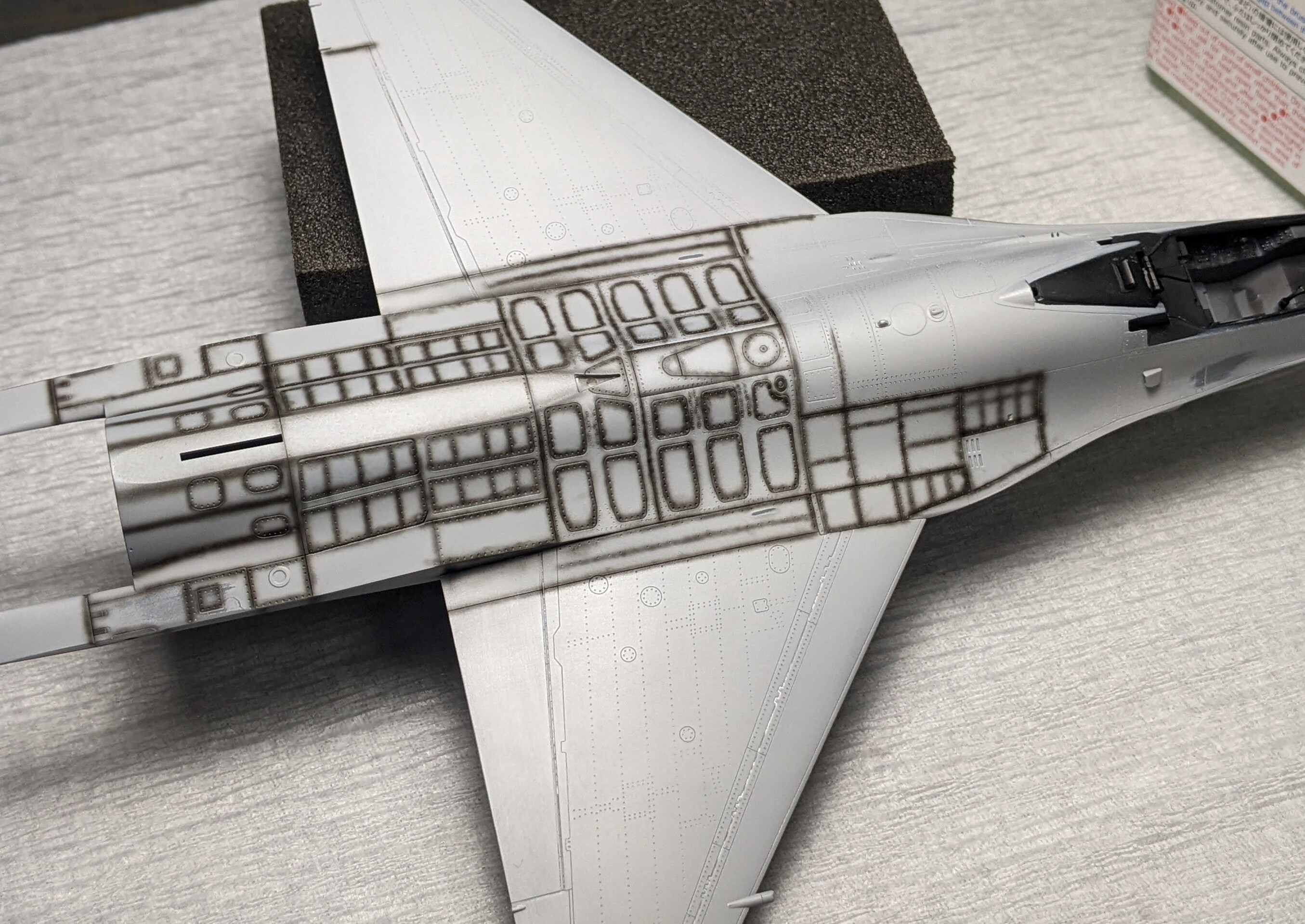 その後、セミグロスブラックでパネルラインやディテールの影、リベットの連なるラインに沿って吹きました。